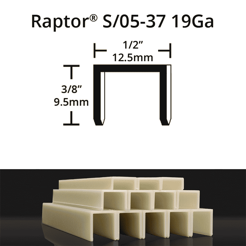 The Raptor S/05-37 composite staples are 19 Gauge – 1/2″ crown – 3/8″ leg length – 5040 Staples per Box – 20 Boxes per case